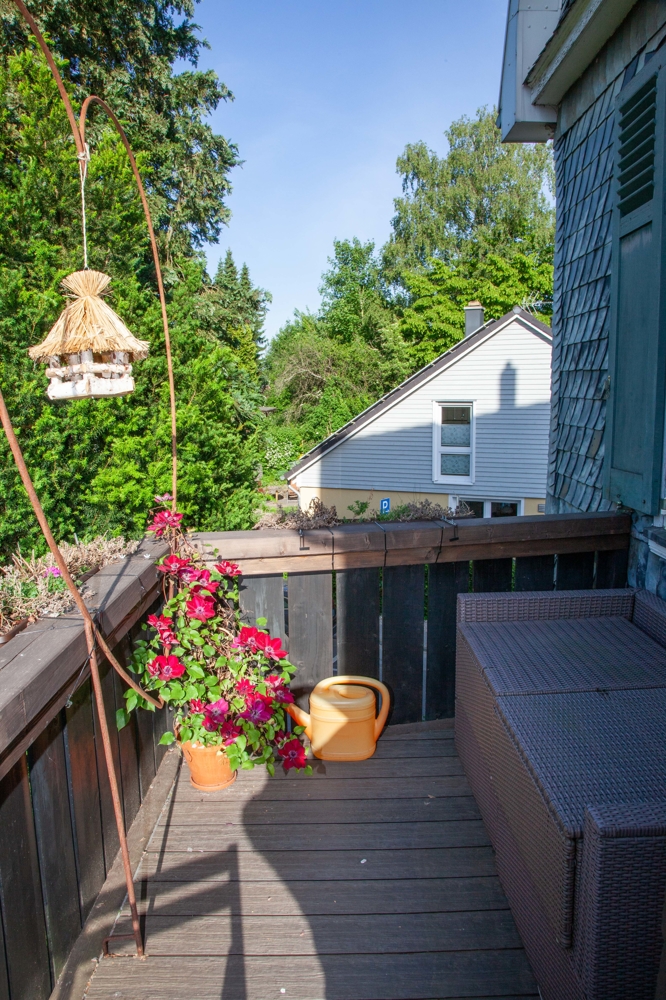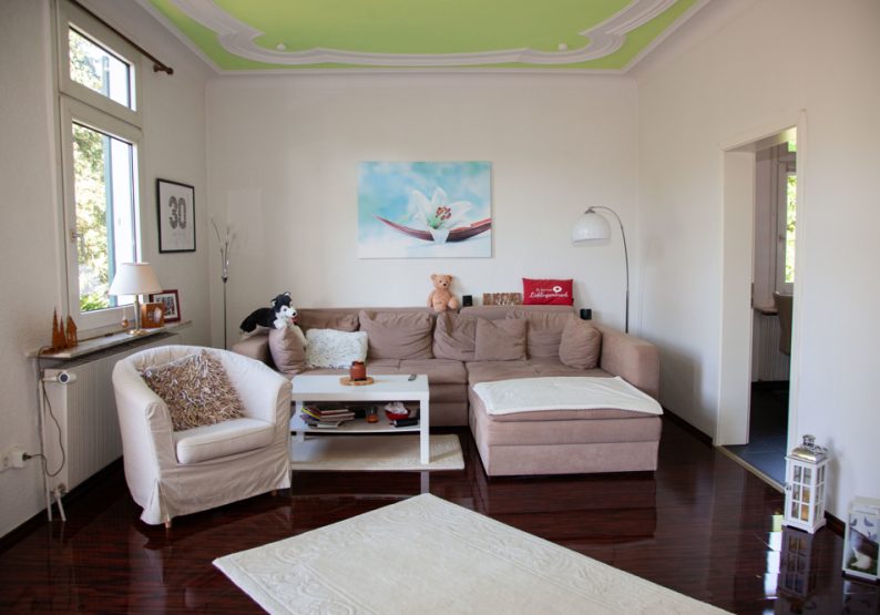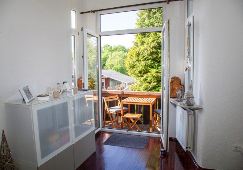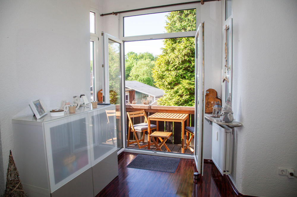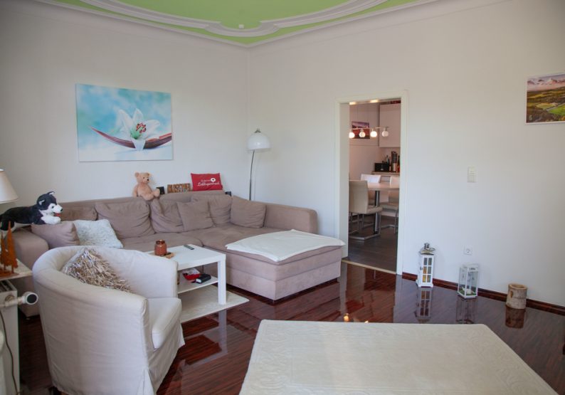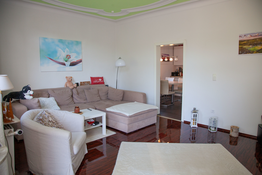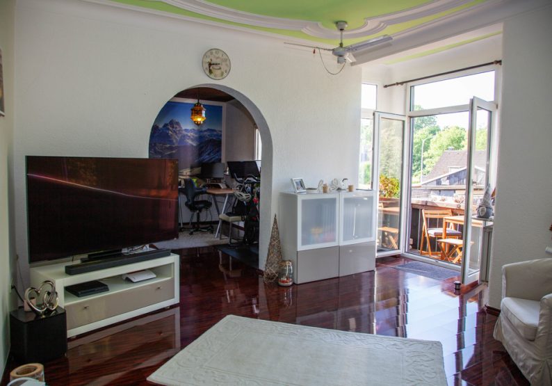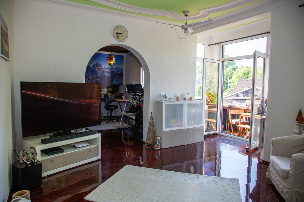 Ein hoher Bogendurchgang verbindet das Durchgangszimmer stilvoll mit dem Wohnzimmer, das mit seinem Altbaucharme überzeugt. Die Fensterflächen in Kombination mit den bodentiefen Balkontüren sorgen nicht nur für eine angenehme Lichtdurchflutung, sondern eröffnen zugleich den direkten Zugang zum angrenzenden Balkon. Durch seine ruhige Lage lädt dieser zum Verweilen und Entspannen im Freien ein und erweitert den Wohnraum auf harmonische Weise.