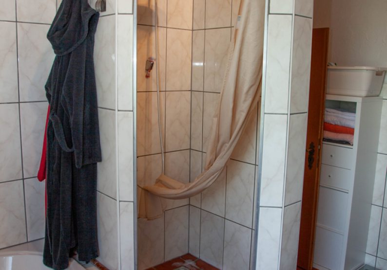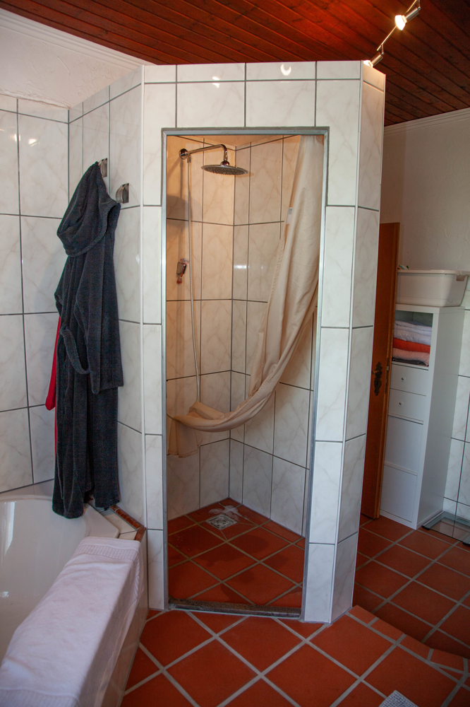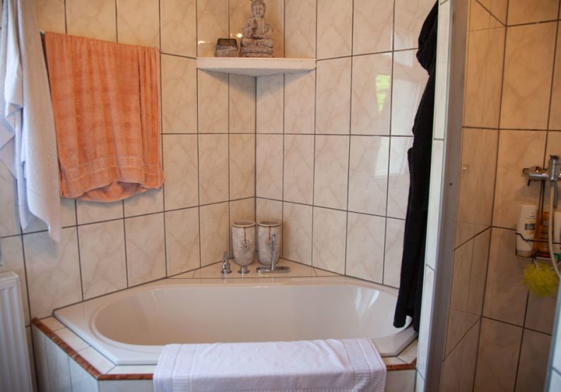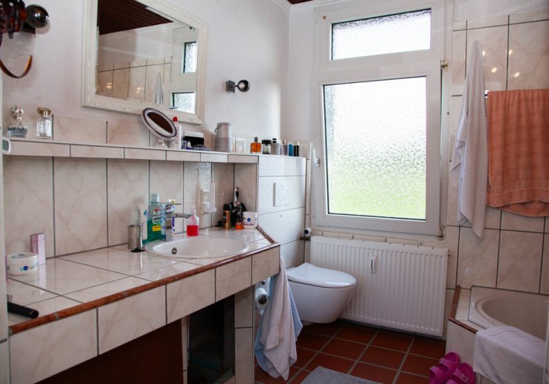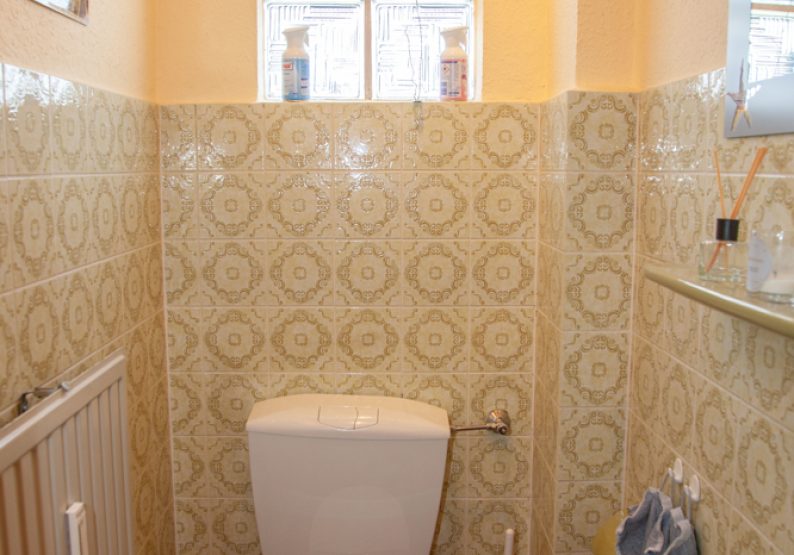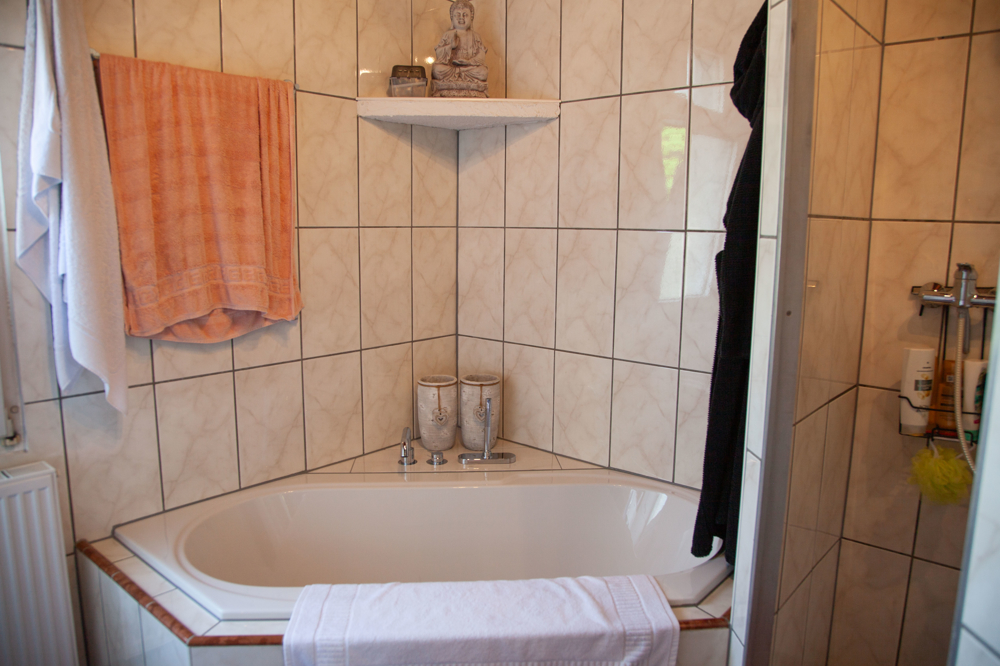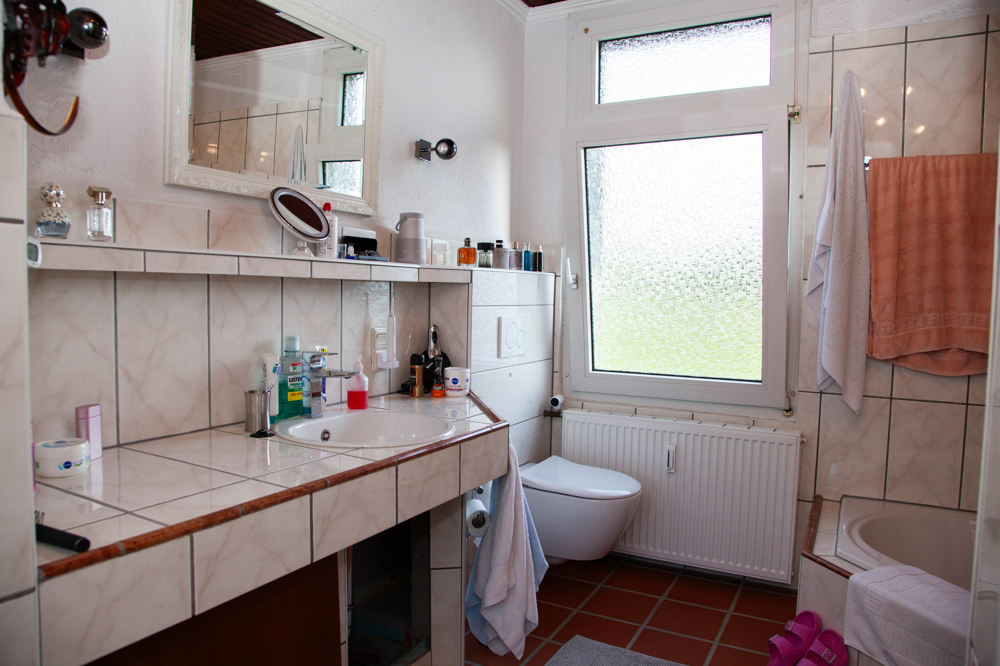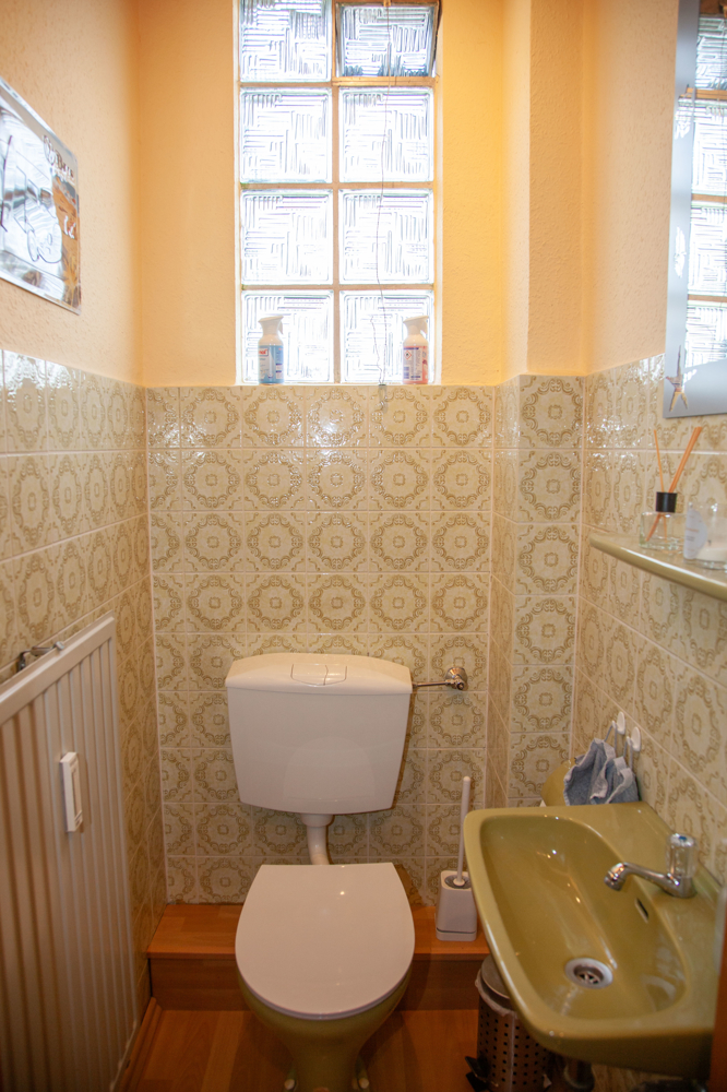 Ein separates Gäste-WC sorgt für zusätzlichen Komfort im Alltag. Das angrenzende Badezimmer ist als Tageslichtbad gestaltet und verfügt über eine Eckbadewanne sowie eine separate Dusche.