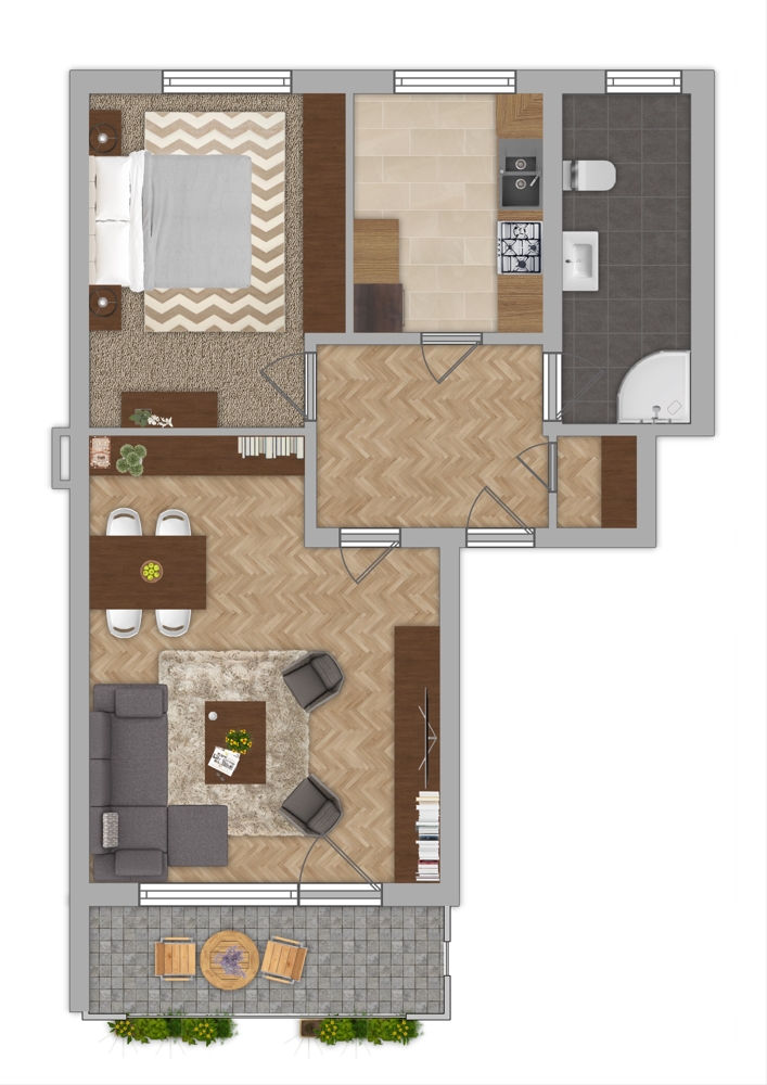 Insgesamt stehen Ihnen ca. 66 m² Wohnfläche zur Verfügung, die sich auf zwei Zimmer, eine Küche, eine Diele und das Badezimmer verteilen.