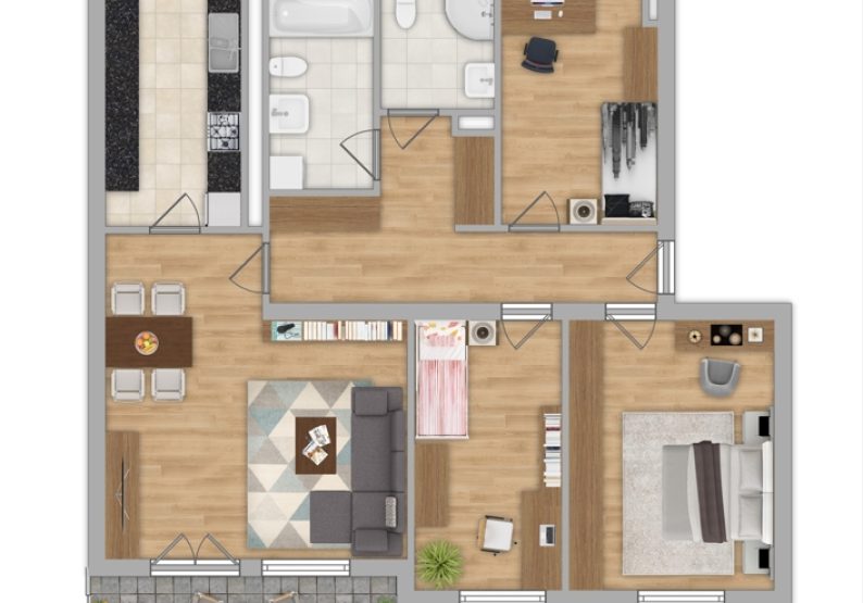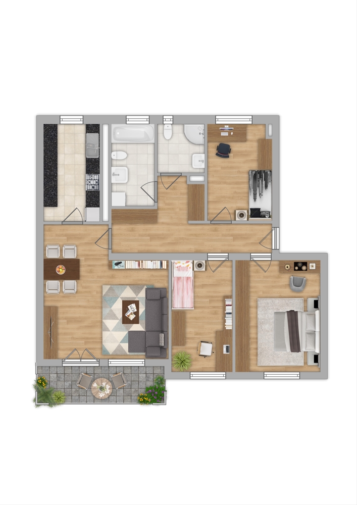 Insgesamt stehen Ihnen ca. 97 m² Wohnfläche zur Verfügung, die sich auf ein großzügiges Wohn- und Esszimmer, drei Schlafzimmer, die Küche, zwei Badezimmer und die Diele verteilen.