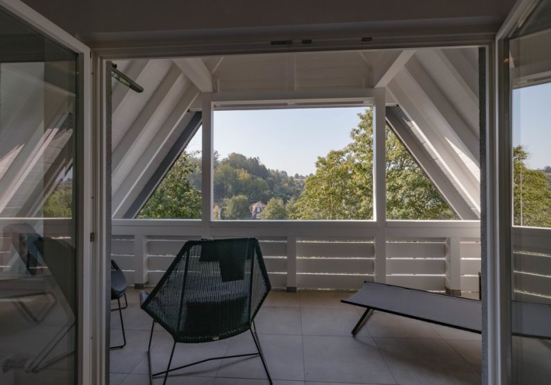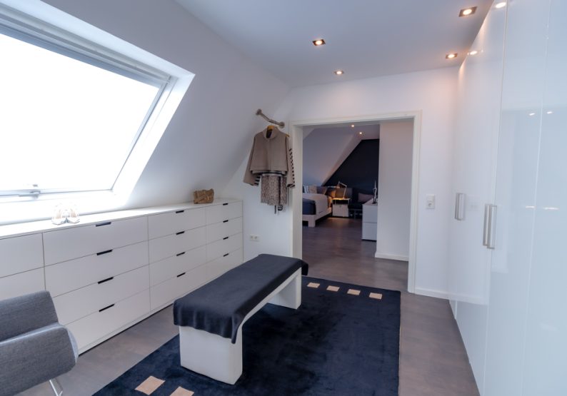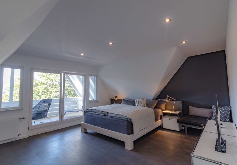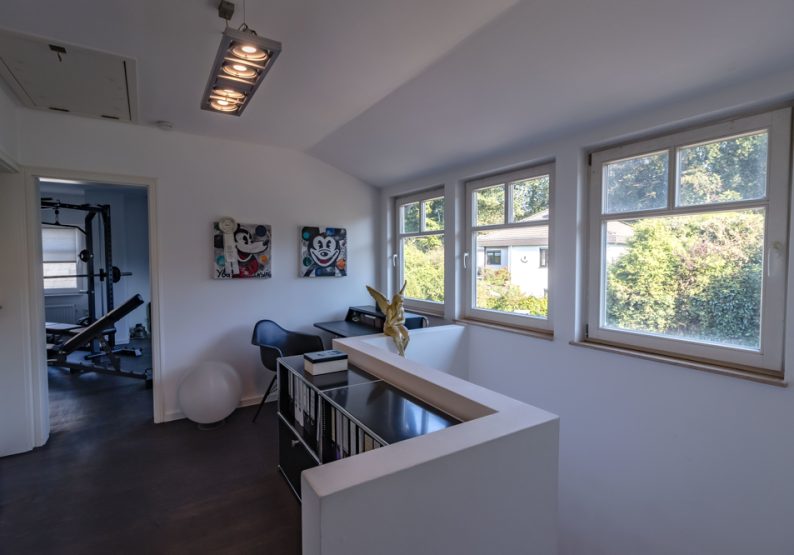 Die halboffene Treppenkonstruktion führt zu einer Empore im Dachgeschoss von wo aus Sie alle dortigen Zimmer erreichen können. Dies sind im Einzelnen das Familienbad mit seiner enormen Größe und Ausstattung und drei unterschiedlich große Kinder- oder Schlafzimmer. Highlight ist hier sicherlich die an eines der aktuellen Kinderzimmer direkt angeschlossene Loggia für schöne, ruhige Stunden der Zweisamkeit.