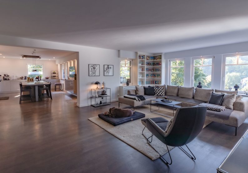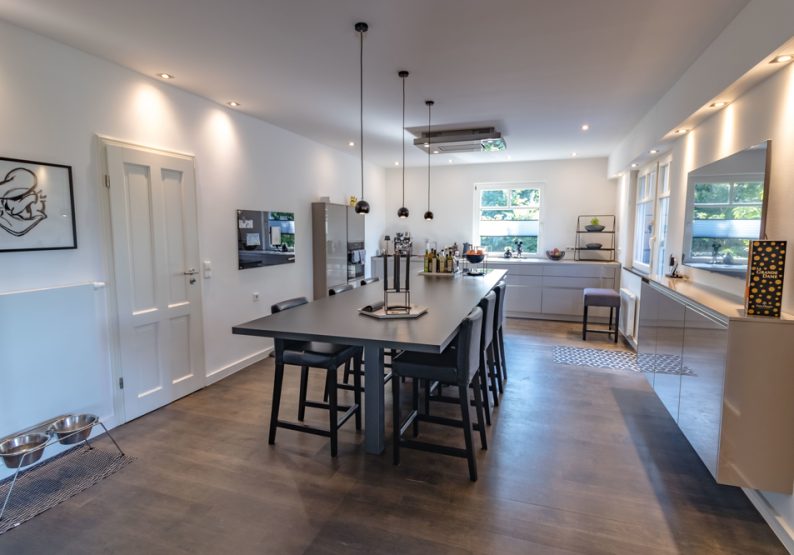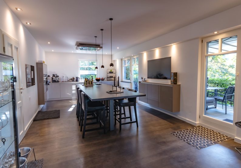 Das Herz des Erdgeschosses schlägt im riesigen und lichtdurchfluteten Wohnbereich mit dem fließenden Übergang in die wunderbar gestaltete Küche mit integriertem Essbereich für die große Familienfeier. Von hier aus können Sie auch über zwei separate Zugänge auf den Sonnenbalkon treten oder darüber auch in den seitlichen Garten gelangen. Wir hoffen Ihnen mit einigen Fotos aus diesem Bereich einen guten ersten Eindruck vermitteln zu können.
