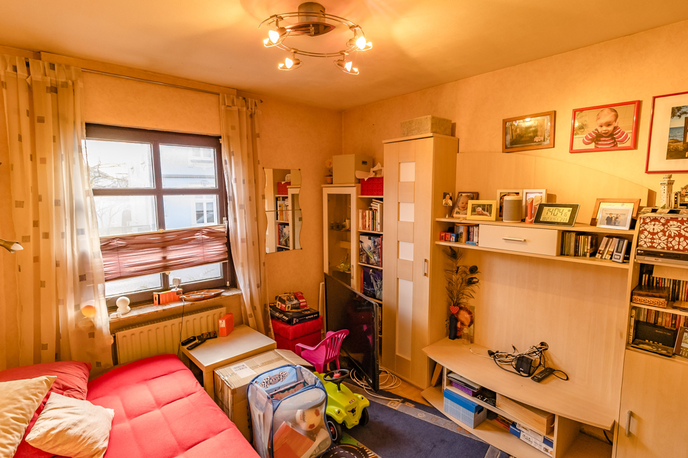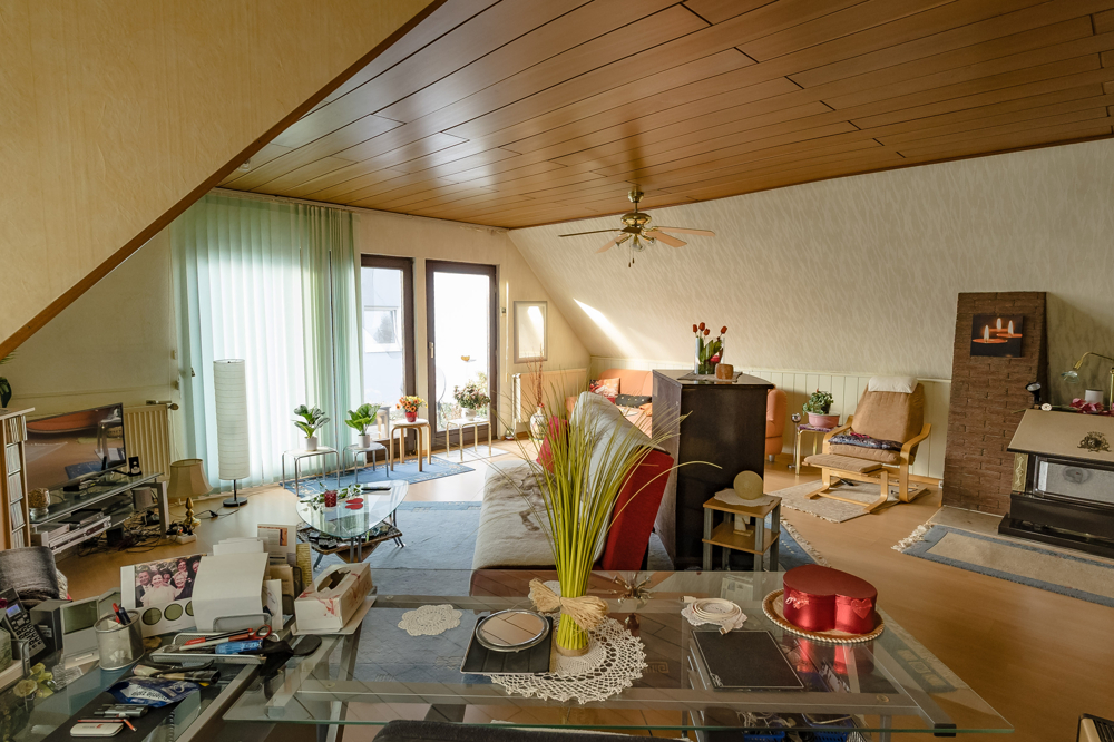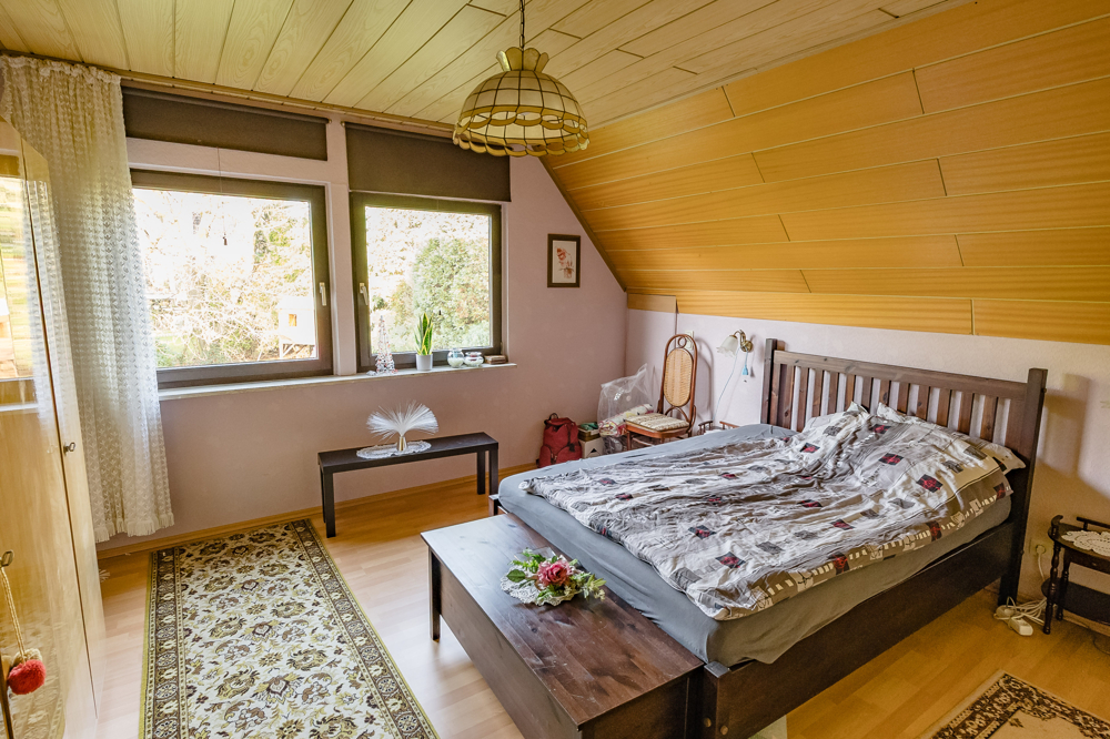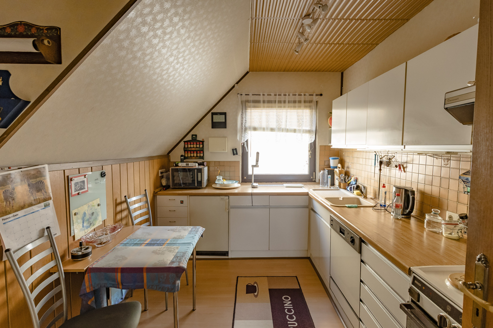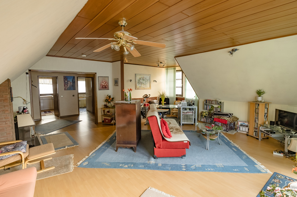 Im Dachgeschoss wartet ein ähnlich großer Wohn- und Essbereich auf Sie. Auch das Schlafzimmer ist sehr großzügig und hat einen wunderbaren Blick in den Garten. Das Zusatzzimmer ist recht klein und kann gut als Büro genutzt werden. Eine Küche und ein Badezimmer, wie im Erdgeschoss mit Badewanne und Dusche ausgestattet, runden diese Etage ab.