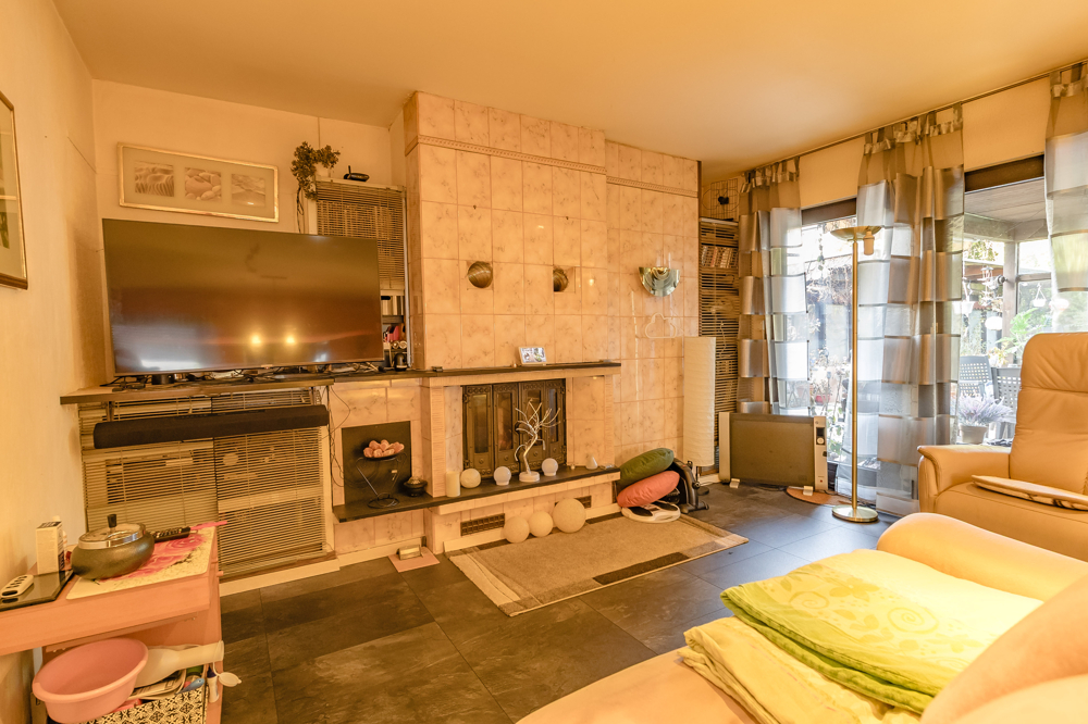 Die Erdgeschosswohnung zeichnet sich durch Großzügigkeit aus. Der riesige Wohn- und Essbereich mit Kaminecke und Zugang zum Garten bietet einen großen Wohlfühlfaktor. Aus diesem Bereich gelangt man direkt auch in die Küche, die über einen kleinen praktischen Abstellraum verfügt. Ein separater Flur verteilt dann in die weiteren Räume auf dieser Ebene: zwei Schlafzimmer und ein renoviertes Bad mit Badewanne und Dusche.